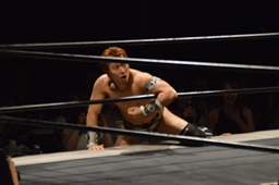 大石コーナーに上ってダイビングクロスボディ(左写真)。