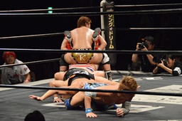 ウラノが福田のバック取ってジャーマン狙う(左写真)、結局膠着状態に。