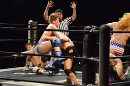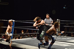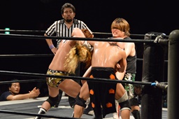高梨と平田が福田に対しダブルのブレーンバスター狙う(右写真)、