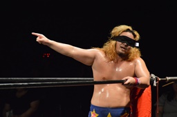 福田の目隠しが取れそうになったのでセコンドの竹下が巻き直す(右写真)。10分経過。