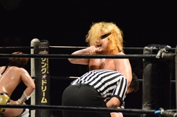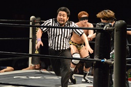 福田が松井レフェリーにパーフェクトプレックスの体勢(右写真)、松井レフェリーエスケープ。15分経過。