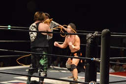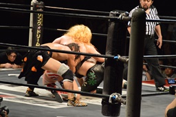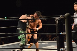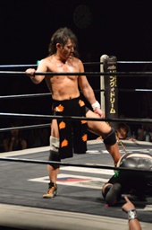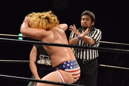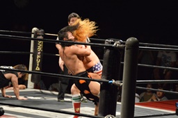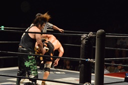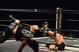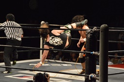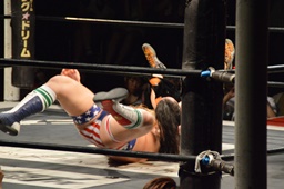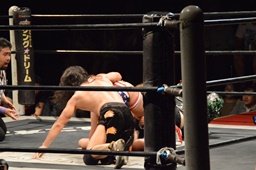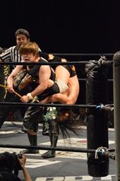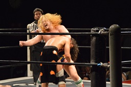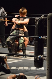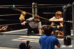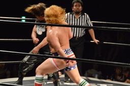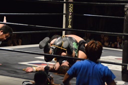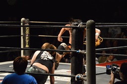 バックドロップは高梨ブロック、押さえ込もうとしたウラノを蹴り上げるとウラノは場外に(右写真)。