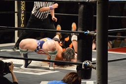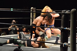3番目のルールワンカウントフォールマッチ。ウラノと福田と高梨がバックの取り合い(右写真)、