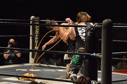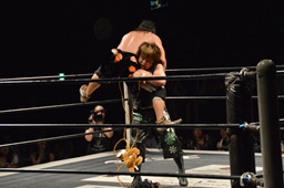 トップロープに引っ掛けてドロップキック(左写真)、カウント2。