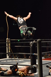 ロープスタナーからコーナーに上ってダイビングボディプレス(左写真)、高梨かわす。