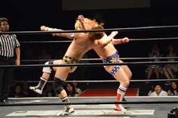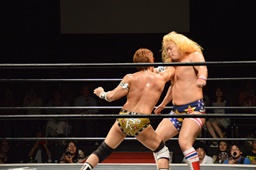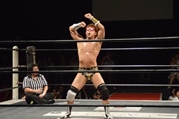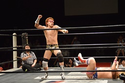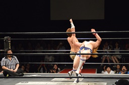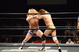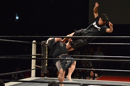 福田ロープに飛ぶ、平田カウンターのドロップキック(右写真)。