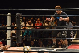 中津が場外からHIRATA GO!サングラスを持ってくる(左写真)。しかし平田はダウン中。
