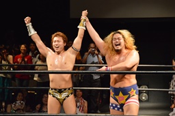 福田が平田の手を上げる(右写真)。