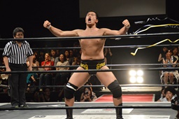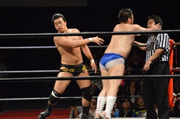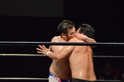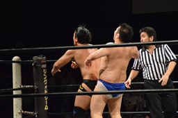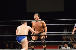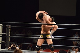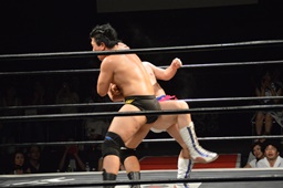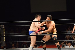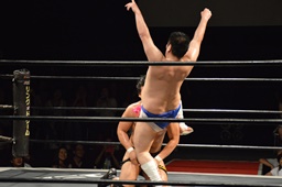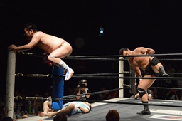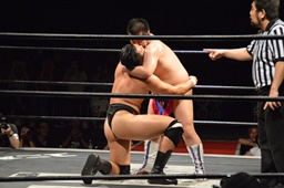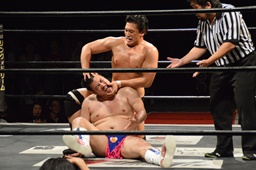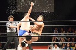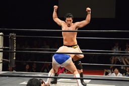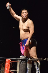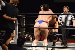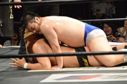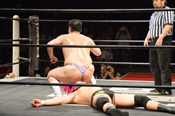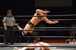 樋口ボディスラムからロープに飛んでボディプレス(右写真)、カウント2。