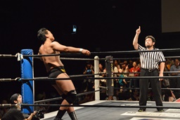 ディーノはこれに対し90°ずつ回転しながらのナイトメア(右写真)、ディーノ自分の顔を殴って樋口の顔面に座り込む、カウント2。