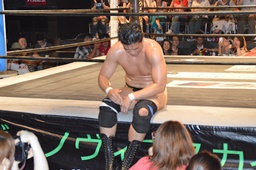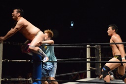 樋口GMに「GM、今まで試合に出てきた人をチェックしてたんですけど、まだ出てない人がHARASHIMAさん、彰人さん、KUDOさん、高梨さん、ディーノさん。これって普通考えたらKUDOさん&高梨さん vs HARASHIMAさん&彰人さんじゃないですか、メイン。自分の相手はディーノさん?昼のプロレス甲子園で1日3試合やって優勝して、そのご褒美が男色ディーノさんってないですよね?」(左写真)