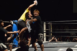 ディーノが樋口をリングに戻す(左写真)。