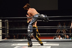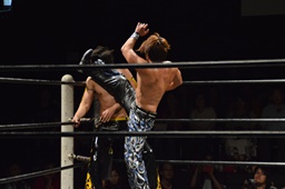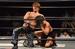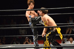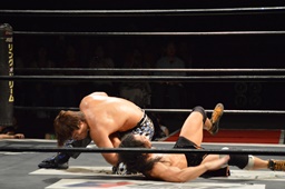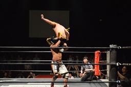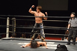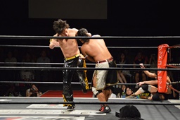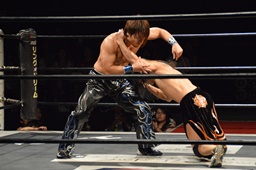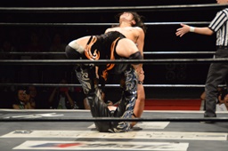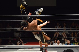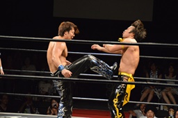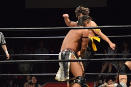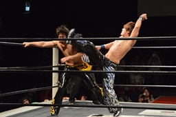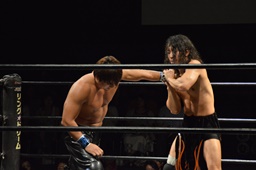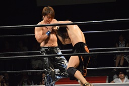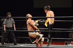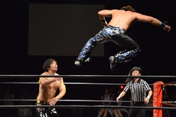 彰人にダイビングダブルニーアタック(右写真)、カウント2。