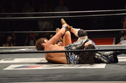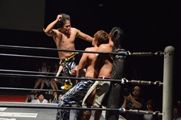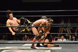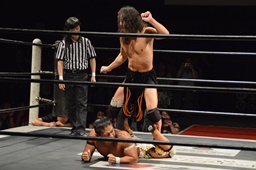 HARASHIMAストンピング連打、彰人にタッチ。彰人ガットショット、河津落としから彰人十字架固め(左写真)、カウント2。