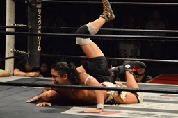 高梨ヘッドロックからフライングメイヤー、HARASHIMAはヘッドシザーズに切り返す(左写真)。両軍タッチ。