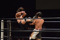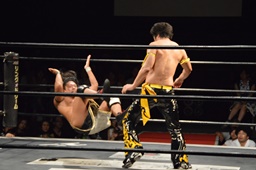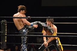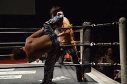 KUDOロープに振ってミドルキック(右写真)、高梨を呼び込む。