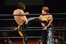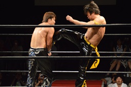 対角線コーナーに振る、KUDO切り返して突っ込む、HARASHIMAエプロンに出てハイキック(右写真)、