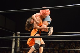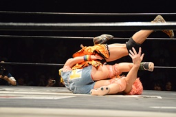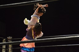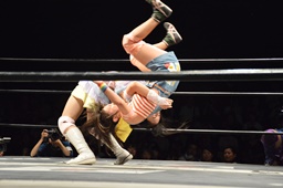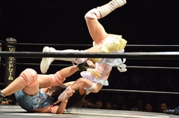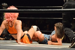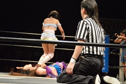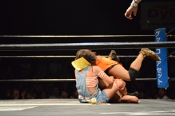 里歩はノーザンライトスープレックスに切り返す(左写真)、カウント2。