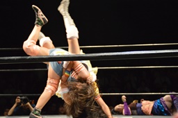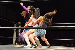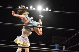 里歩がジャーマン狙う、さくらブロック、「ことり」が里歩のバック取る(右写真)。