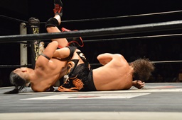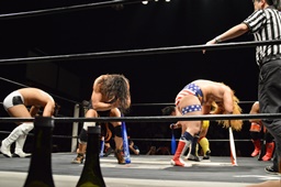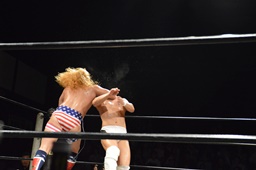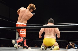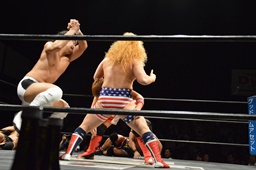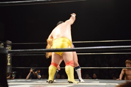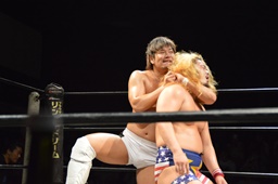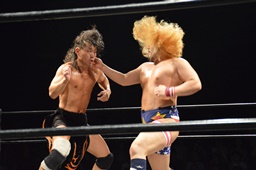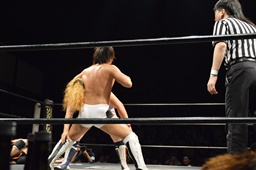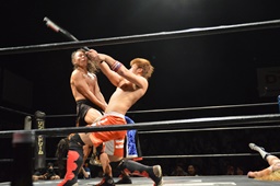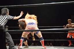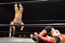 彰人が高梨を肩に担いでエアプレンスピン、高梨はウニベルサルで反撃(左写真)。