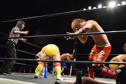 伊橋が中津にストンピング、コーナーに上って誰もいないところにムーンサルトプレス(右写真)。15分経過。