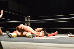 バットを振り回した末に自分の頭に当ててしまった中津が伊橋に覆いかぶさる形でダウン(左写真)、カウント3入る。