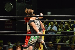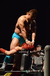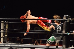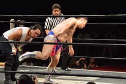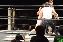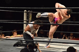 ホモイェに行くかと思ったら側頭部へのキック(左写真)、カウント2。