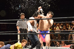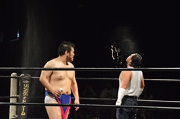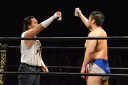 乾杯でスタート(右写真)。この試合は試合中に布袋寅泰とB'zの曲が交互に流れ、布袋の曲が流れている間はディーノのみ3カウントフォールやギブアップを取れる権利が、B'zの曲が流れている間は大家にのみ3カウントフォールやギブアップを取れる権利が与えられ、相手の曲が流れている時には勝利できないルール。