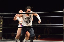 さすがに焦れたのかウラノが松永に先制攻撃(左写真)、ようやく試合開始。