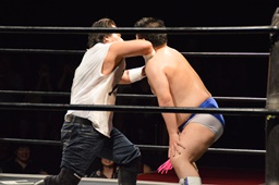 両者ヒザ立ちでパンチの打ち合い(左写真)。
