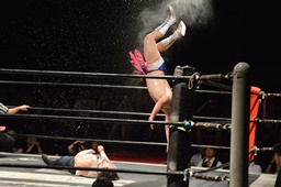 ロープに振ってバックエルボー(左写真)、カウント2。