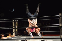 大家ブレーンバスター狙うが、ディーノ切り返して垂直落下式ブレーンバスターに(左写真)。