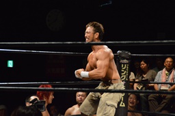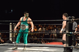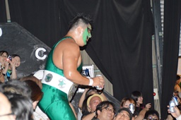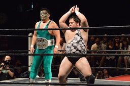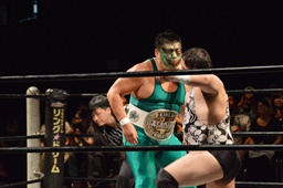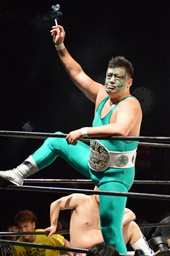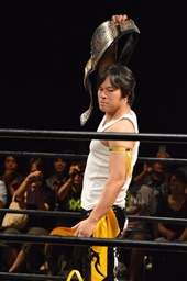 KO-D無差別級王者・KUDO入場(左写真)。