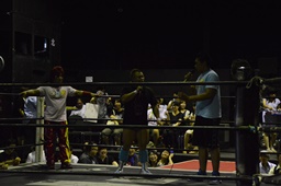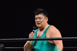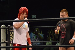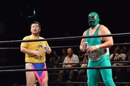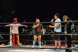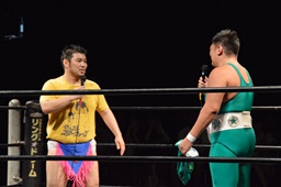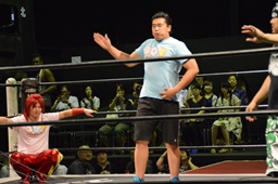 18時、本日のプロデューサーのディーノとスーパーササダンゴマシンがリングに(右写真)。