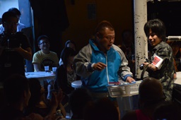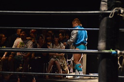 あと2人を待つ(左写真)。しかしここで3分が経ちまた暗転、続きは第2試合の後に。