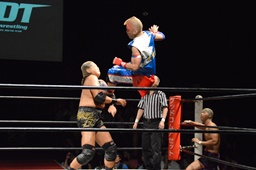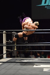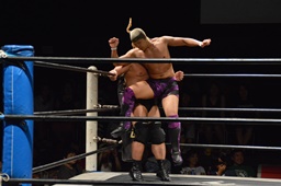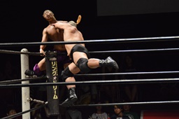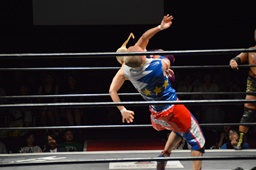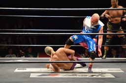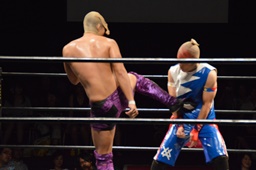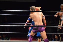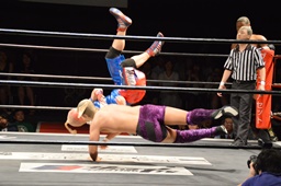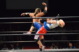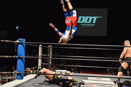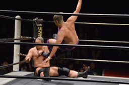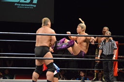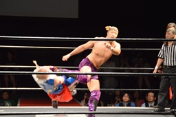 ドロップキック(右写真)、カウント2。ボディスラム、高木にタッチ。