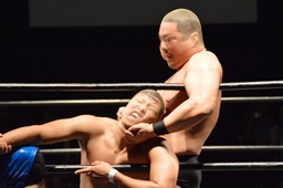 ロックアップ、梅田ヘッドロック(右写真)、勝俣ロープに振る、