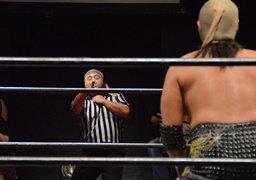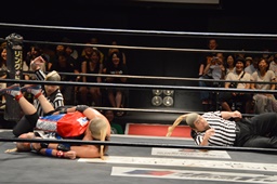 足を引っ掛け転ぶ、復活した木曽レフェリーが3カウント(右写真)。