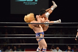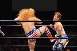 平田が踊る前に宮武が福田に先制攻撃(右写真)、試合開始。