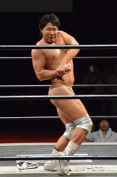 平田がリングイン、宮武がコーナーに振って突っ込むが平田かわし(左写真)手刀。