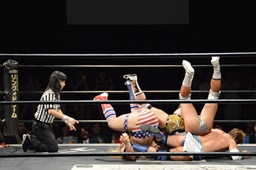 大石背後に回りこむと3人まとめて十字架固め(左写真)、3人ともフォール。
