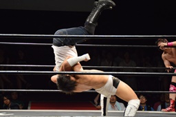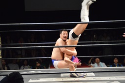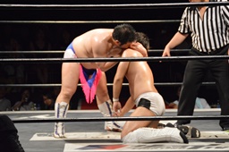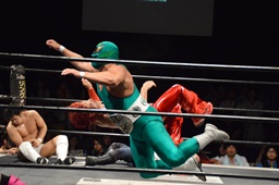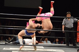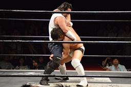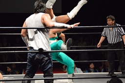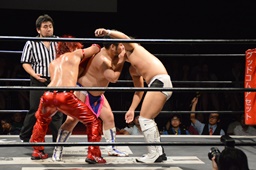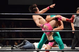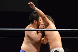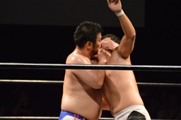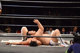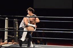 岩崎ダブルアームスープレックス(右写真)、カバーはディーノがカット。