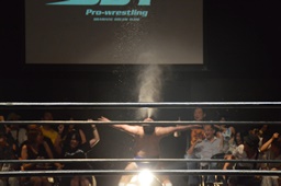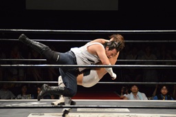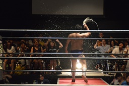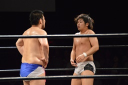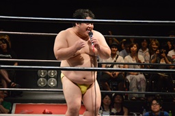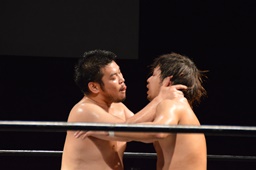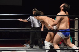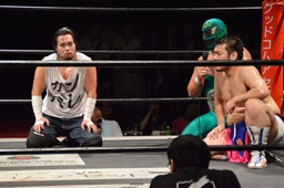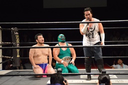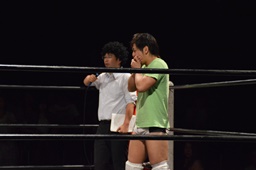 ササダンゴ「大家さん。今、俺たちが3カウント取ったのは岩崎って言って、別に彼自身はチャンピオンじゃない。一介の若手レスラーですから。」(左写真)