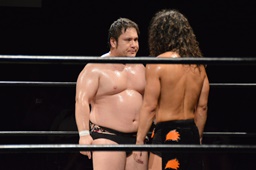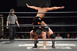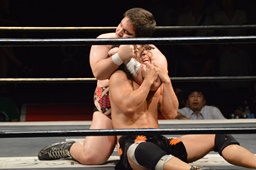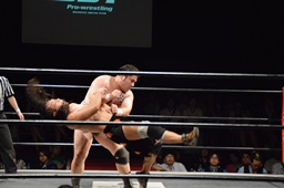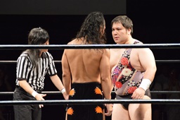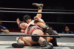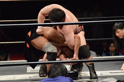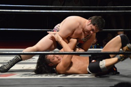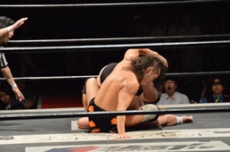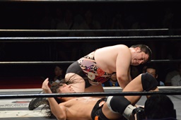 アントンホイップしてハンマーロック、高梨切り返す(右写真)、エビ固めに、カウント1。