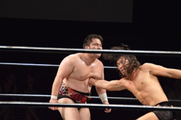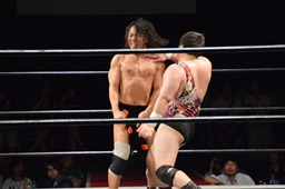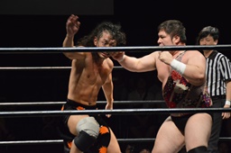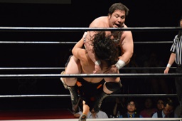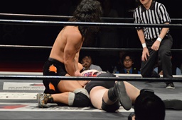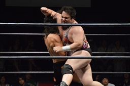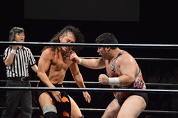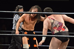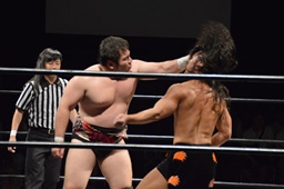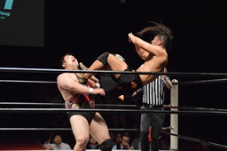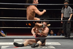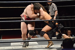 ボディへのパンチ、逆水平連打(右写真)、カウント2。さらにニースタンプ。