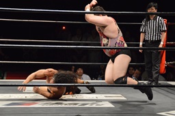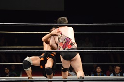 高梨切り返してスコーピオンデスドロップの体勢(右写真)、