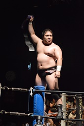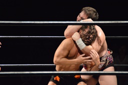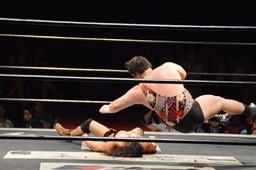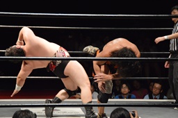 高梨ロープに飛ぶ、アントンカウンターのバックエルボー(左写真)。