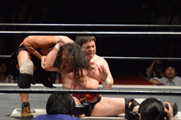 リングに戻して首投げからスリーパー(右写真)、高梨ロープ。
