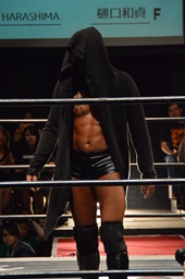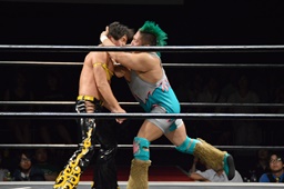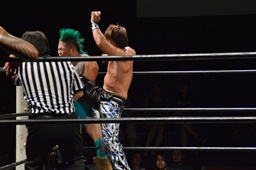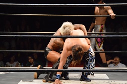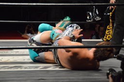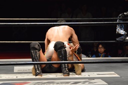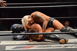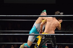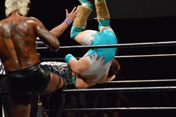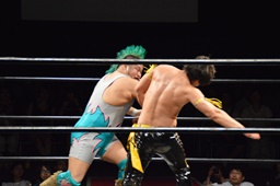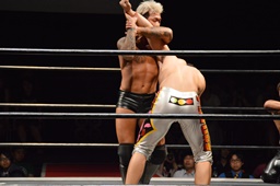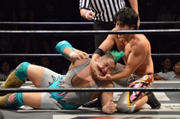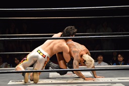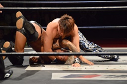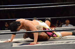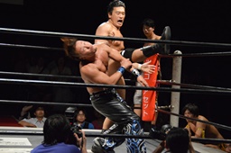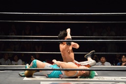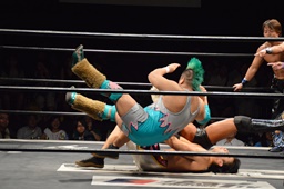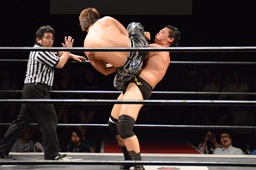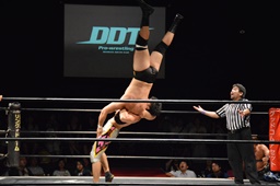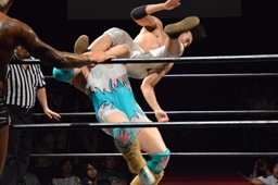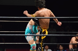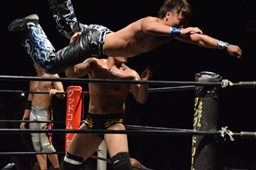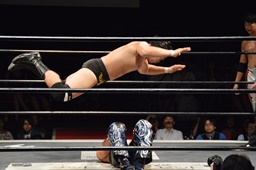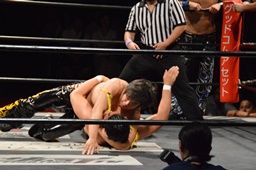KUDO切り返してバック取る、樋口切り返す、KUDOヘッドロックからフライングメイヤー(右写真)、樋口エビ固め、カウント2。KUDOコーナーに押し込んでHARASHIMAにタッチ。