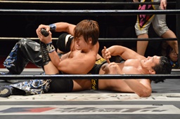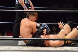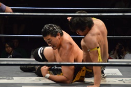 坂口ケサ固め、HARASHIMA体をひねる(左写真)、
